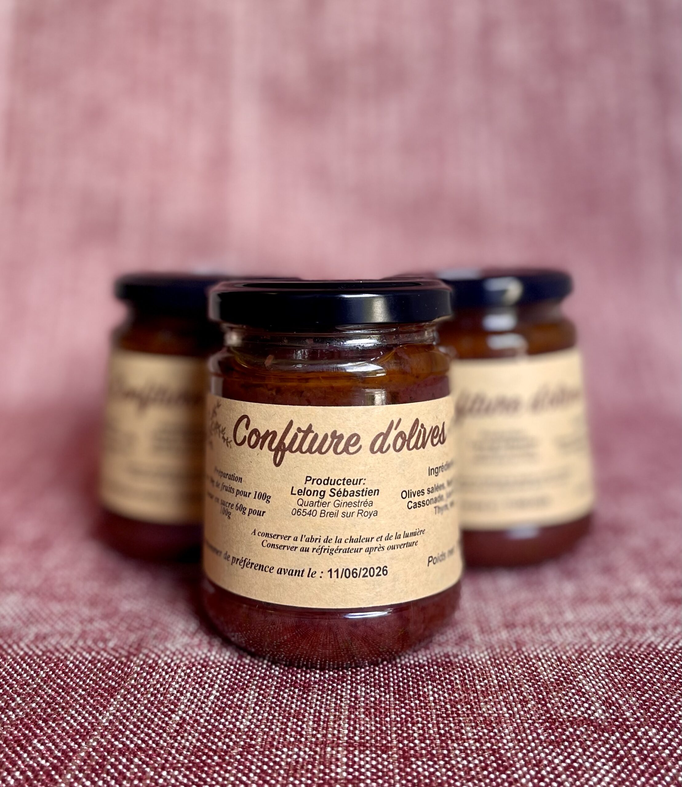 Composition: olives salées, huile d’olives, cassonade, jus de citron, thym, eau.